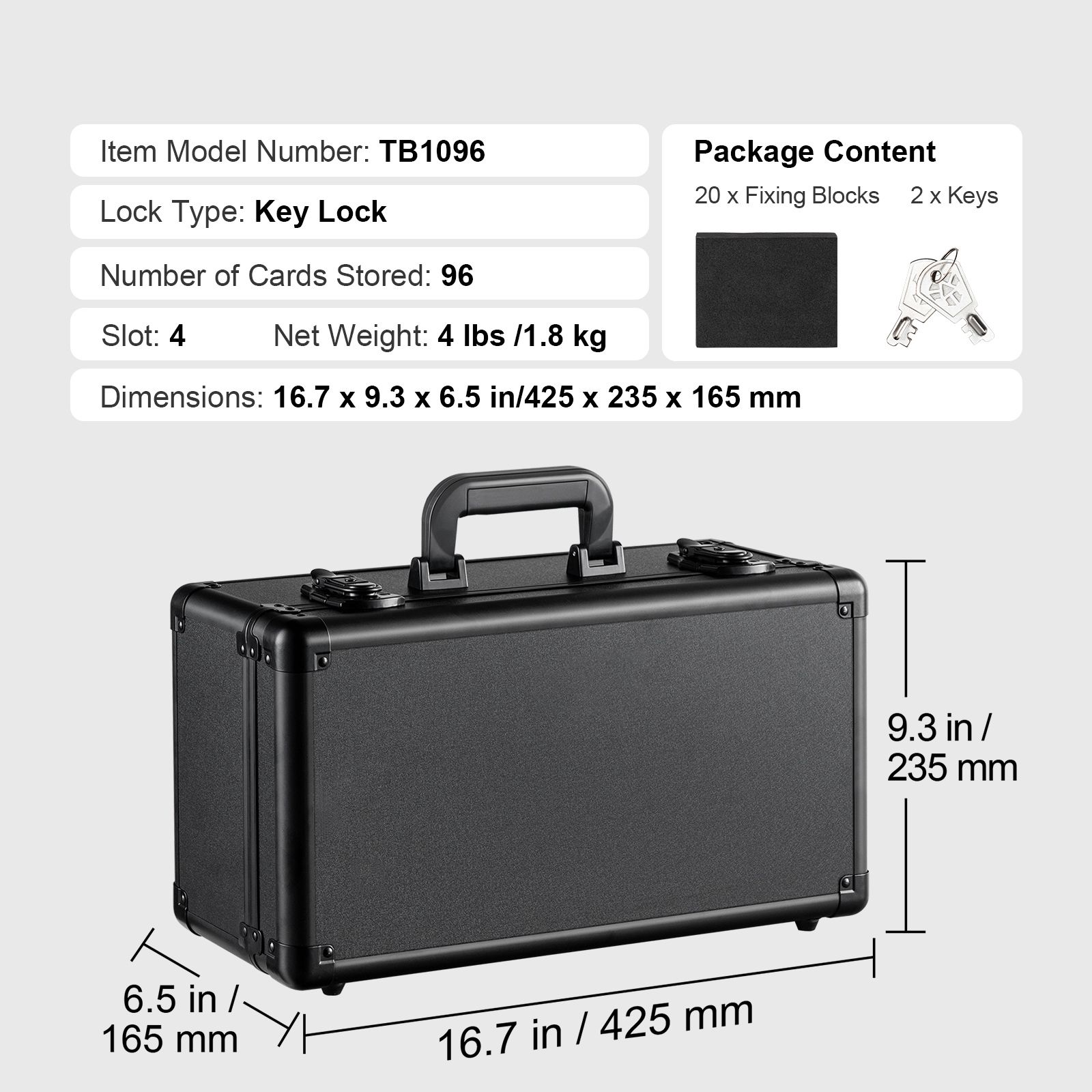 Introducing our graded card case features a 3.5 in/90 mm widened card slot and 20 flexible foam inserts, accommodates up to 96 PSA graded cards, and is compatible with PSA, BGS, SGC, and TOP LOADERS. The lock mechanism, accompanied by 2 keys, safeguard your cards with peace of mind!